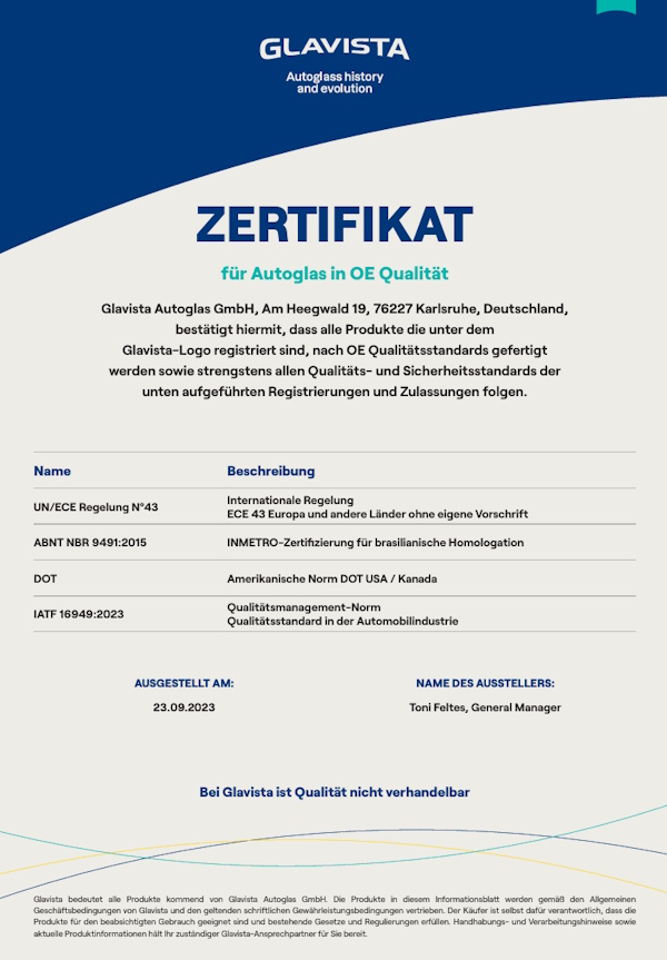 Die grossen Hersteller von Fahrzeugverglasungen haben Ihre Produktion nach internationalen Richtlinien zertifizieren lassen und dafür entsprechnde Qualitätszertifikate erstellt. Die Fahrzeugscheiben werden zum grössten Teil nach der UN/ECE-Regelung R43 und den ECE-Standards für Sicherheitsglas gefertigt.