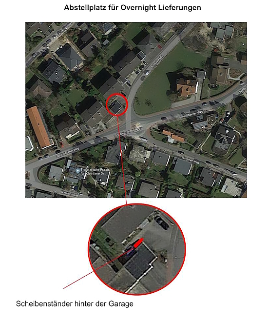 Der Abstellplatz der Lieferungen soll hier beschrieben werden. Bitte senden Sie uns einfach einen Screenshot Ihres GrundstĂĽcks von google Maps.